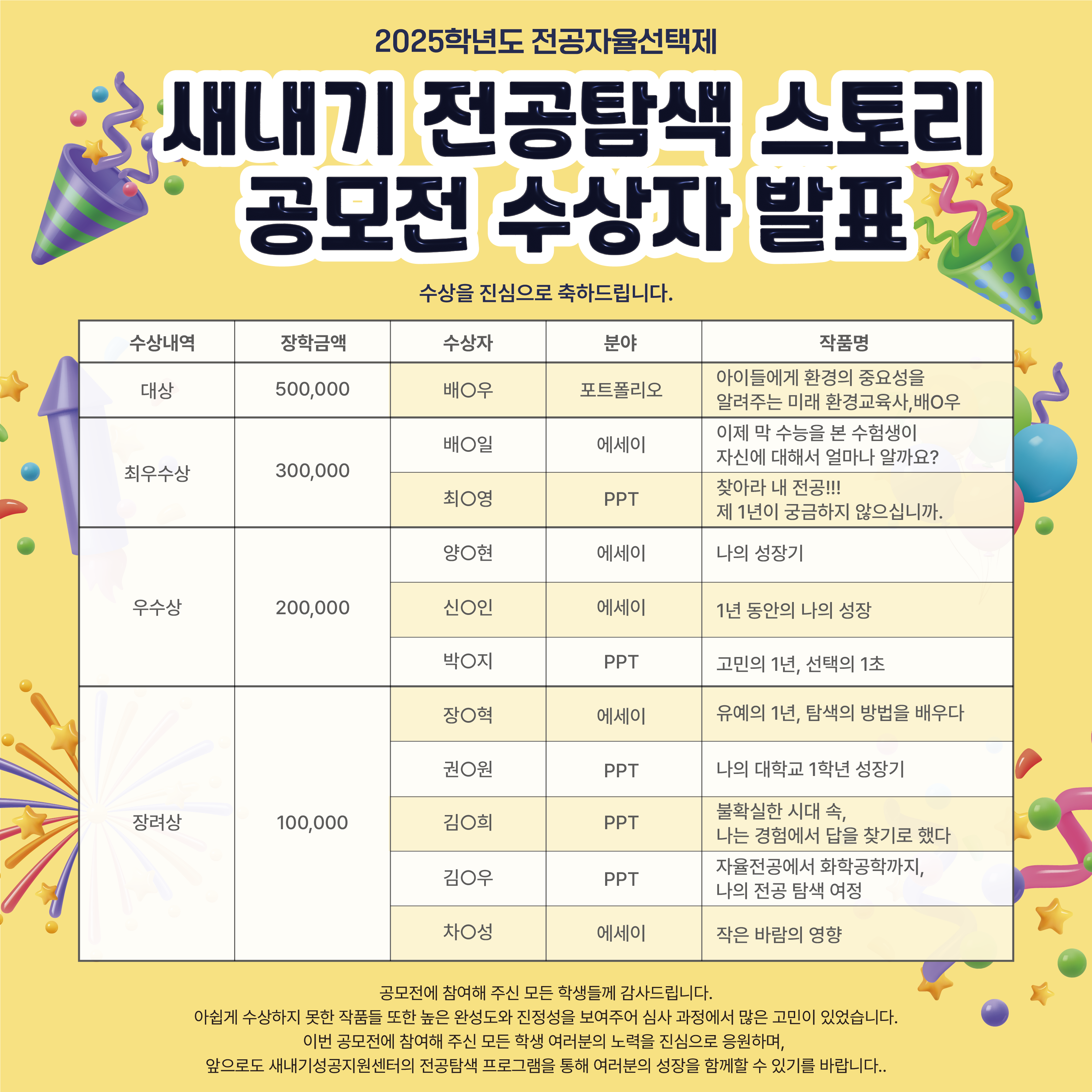 이번 공모전에 참여해 주신 모든 학생 여러분의 노력을 진심으로 응원하며, 앞으로도 새내기성공지원센터의 전공탐색 프로그램을 통해 여러분의 성장을 함께할 수 있기를 바랍니다.
