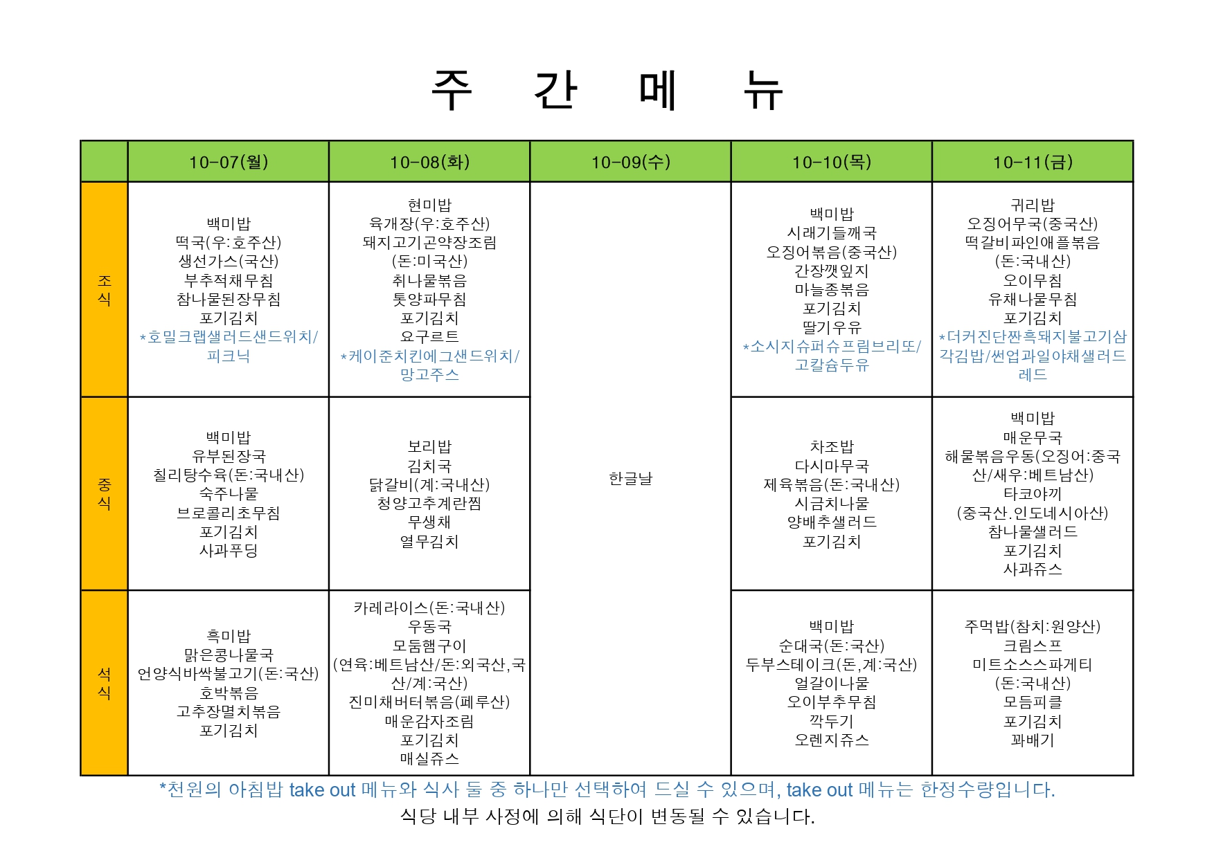 2025. 10. 06. ~ 2025. 10. 10. 주간식단표