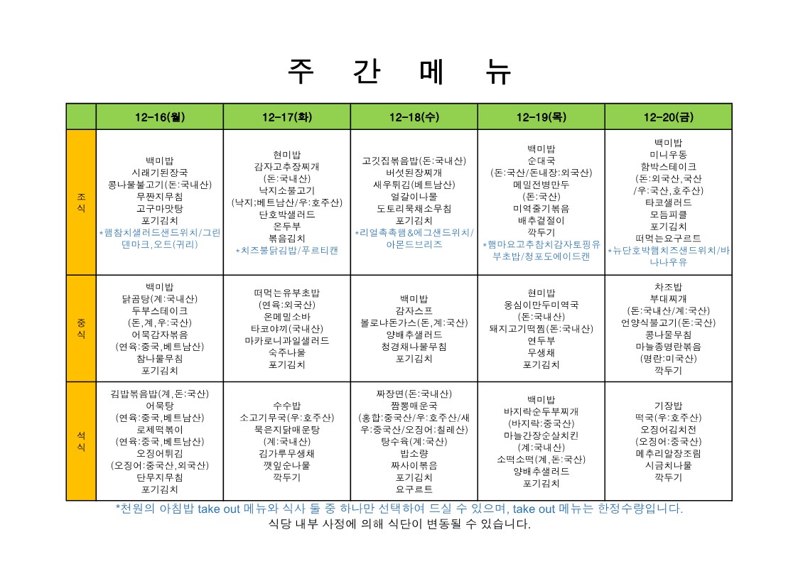 2025. 12. 15. ~ 2025. 12. 19. 주간식단표