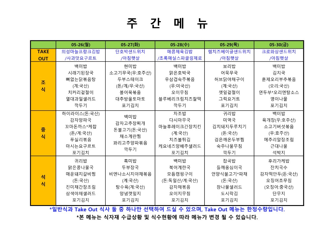 2024. 5. 27. ~ 2024. 5. 31. 주간식단표