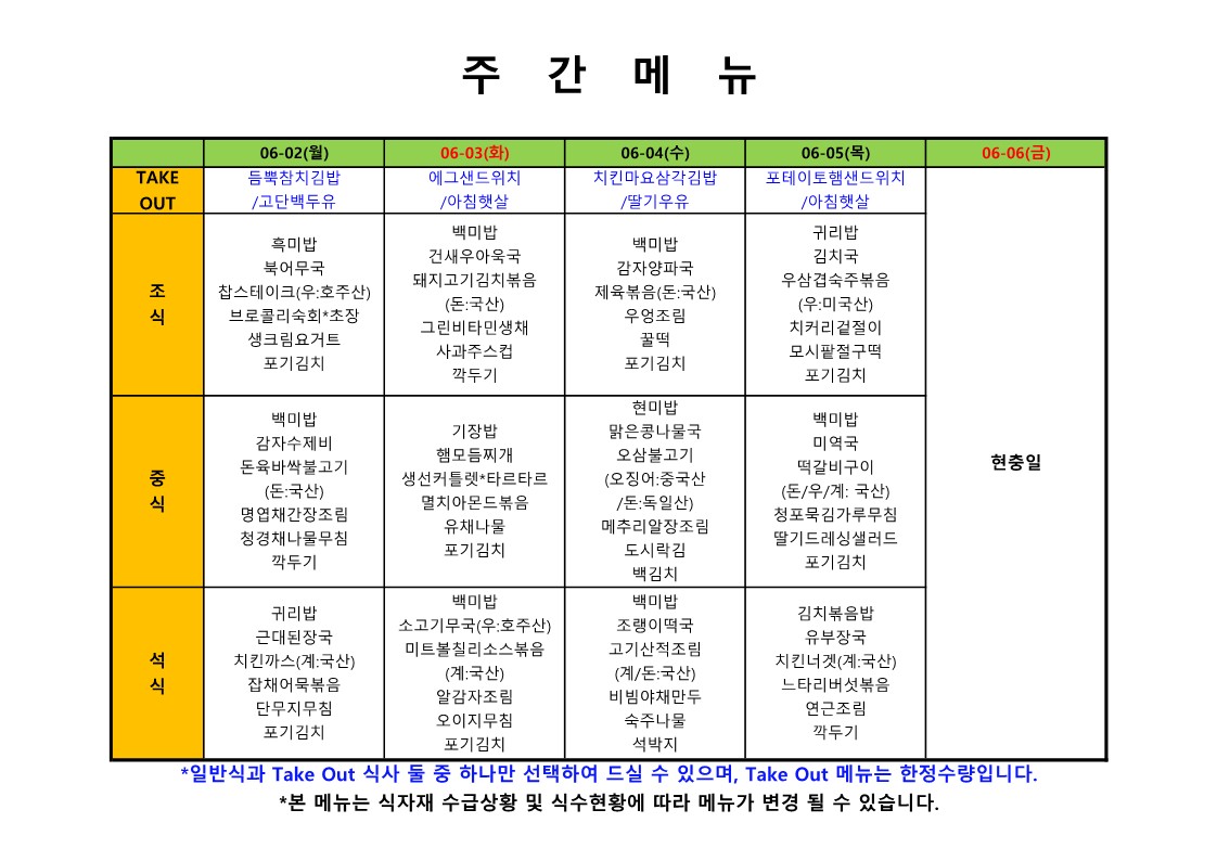 2024. 6. 3. ~ 2024. 6. 7. 주간식단표