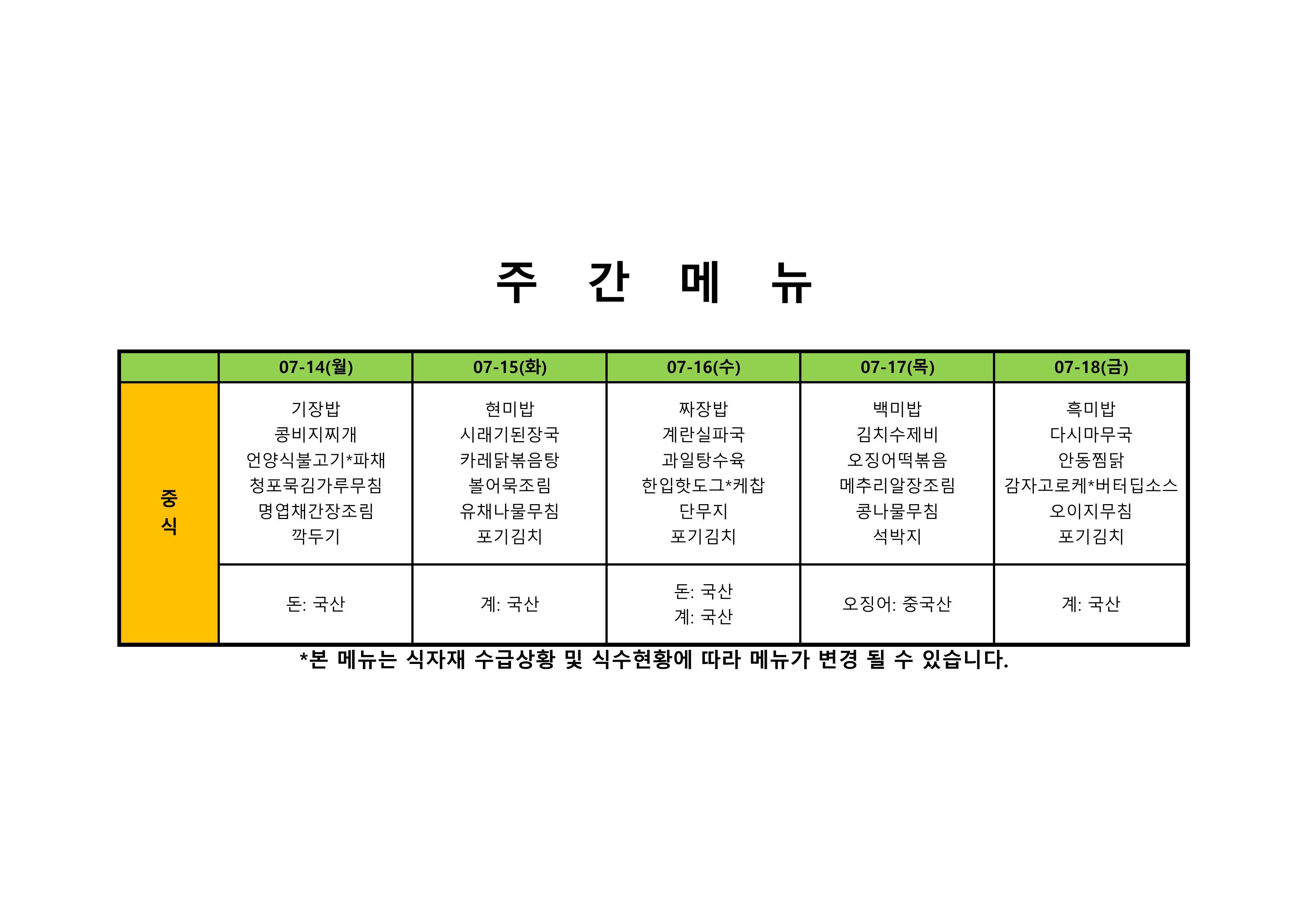2024. 7. 15. ~ 2024. 7. 19. 주간식단표