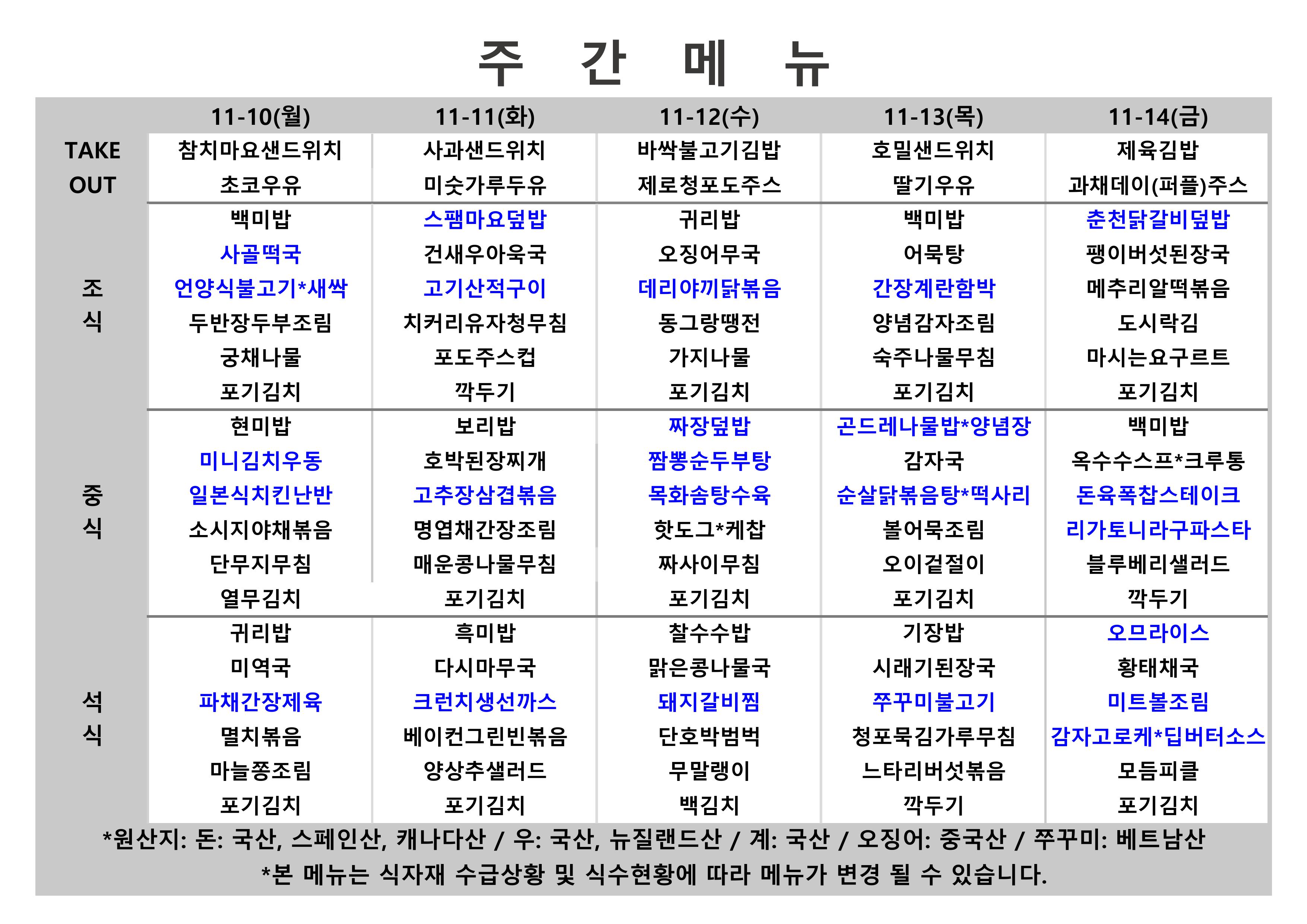 2025. 11. 10. ~ 2025. 11. 14. 주간식단표