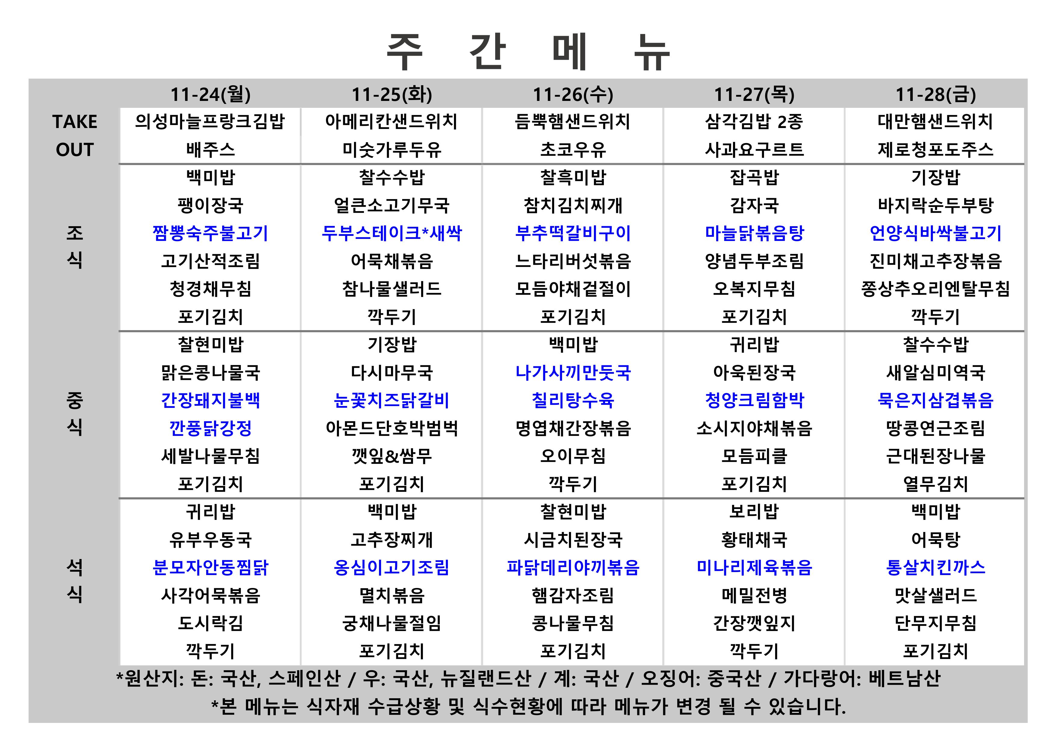 2025. 11. 24. ~ 2025. 11. 28. 주간식단표
