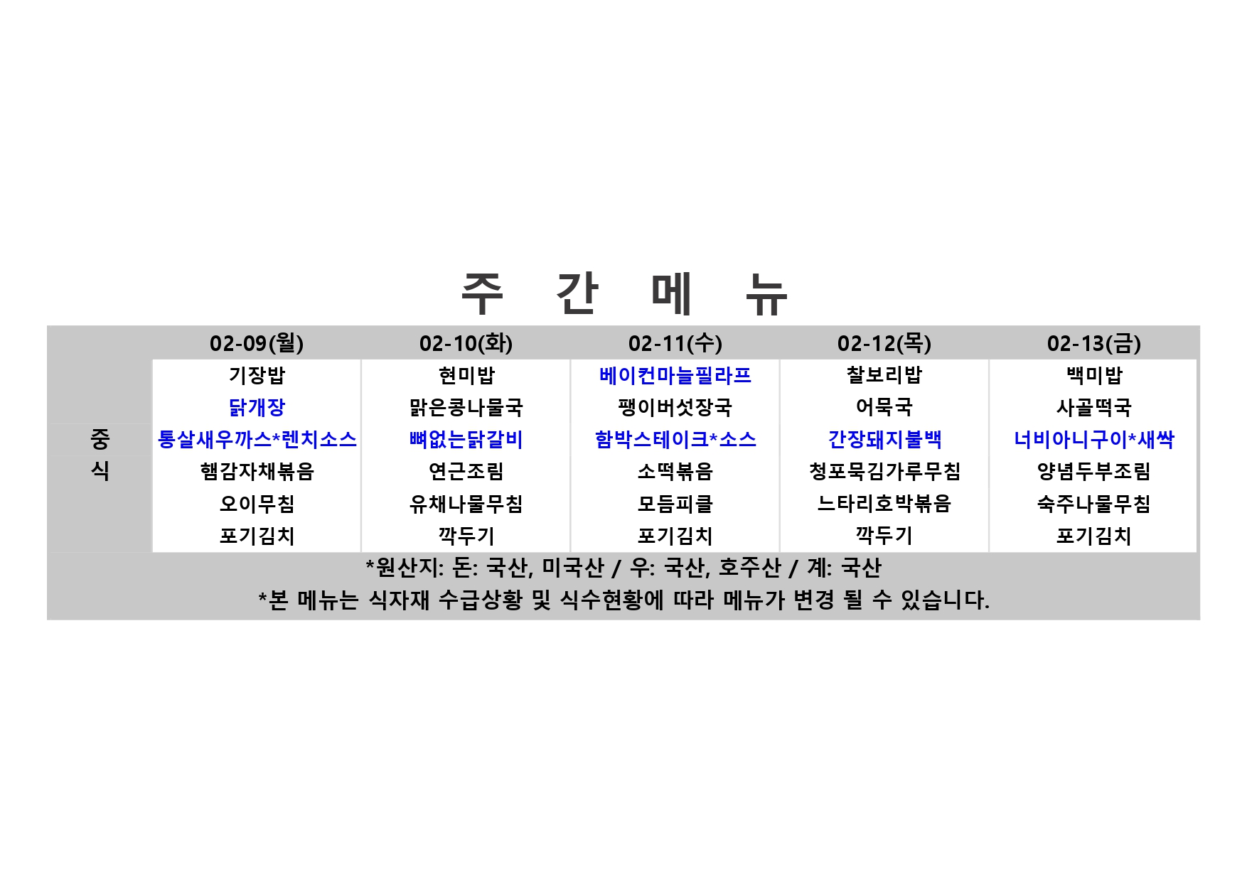 2026. 2. 9. ~ 2026. 2. 13. 주간식단표