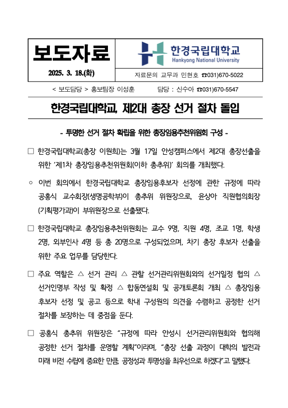fnctId=bbs,fnctNo=570 단축 url 글번호 83550 한경국립대학교, 제2대 총장선거 절차 돌입 작성일 2025.03.19 수정일 2025.03.19 작성자 이윤석 조회수 3354 첨부파일 (보도자료) 제1회 총장추천위원회 회의 개최.hwp 댓글 작성 필수 입력 항목작성자 손님 댓글 내용을(를) 입력합니다.(필수 입력 항목)