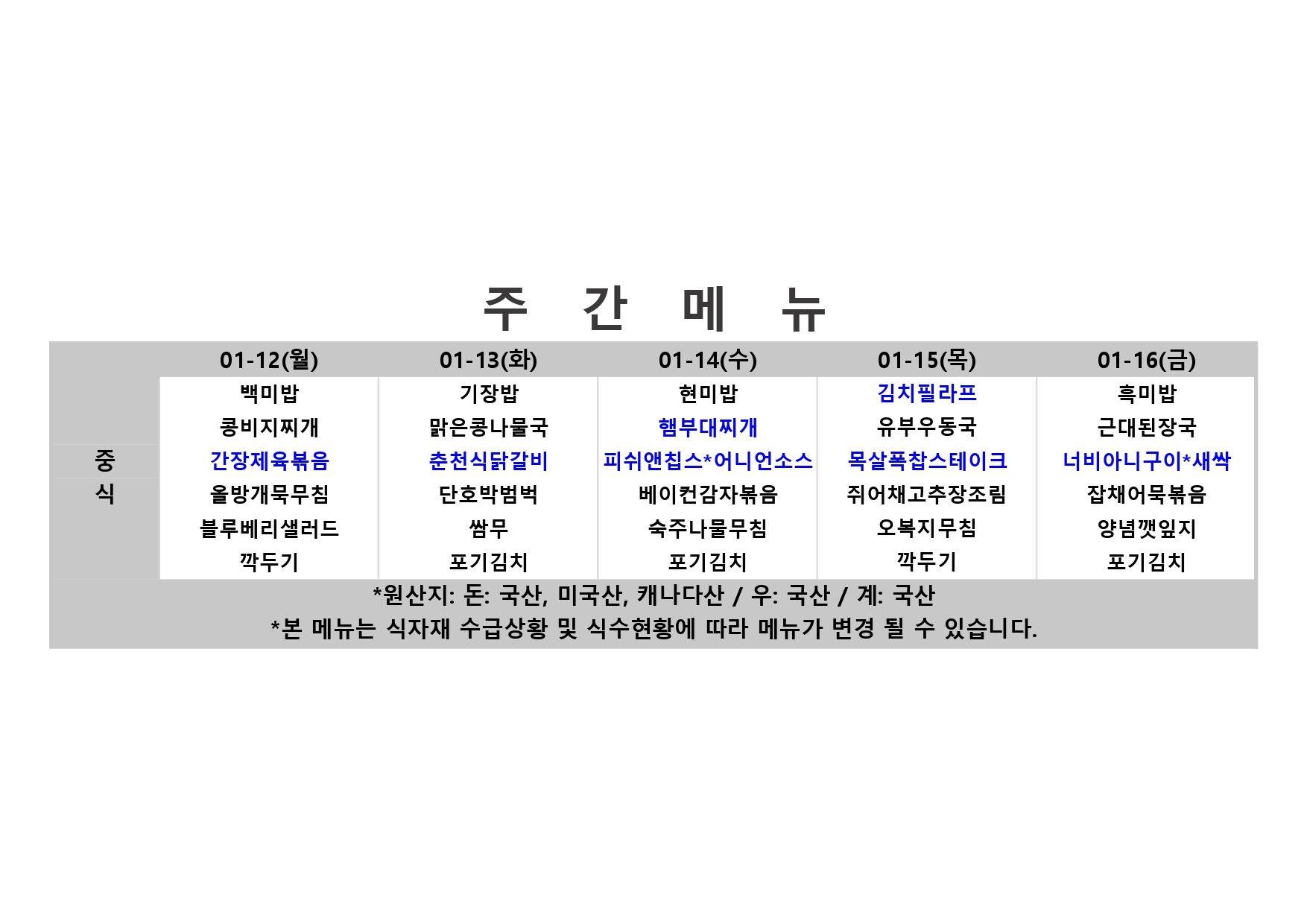 fnctId=bbs,fnctNo=484 단축 url 글번호 91763 2026. 1. 12. ~ 2026. 1. 16. 주간식단표 작성일 2026.01.08 수정일 2026.01.08 작성자 학생생활관(분원) 조회수 22610 다음글 2026. 1. 19. ~ 2026. 1. 23. 주간식단표 윤현지 2026-01-15 14:11:08.0 이전글 2026. 1. 5. ~ 2026. 1. 9. 주간식단표 윤현지 2026-01-02 09:15:20.0 RSS 2.0 총 100 개의 게시물이 있습니다. 게시물 검색 제목 작성자 게시글 리스트 학생생활관 이용 - 주간식단 번호 제목 작성자 작성일 조회수 100 2026. 3. 16. ~ 2026. 3. 20. 주간식단표 새글 학생생활관(분원) 2026.03.12 5034 99 <평택캠퍼스 재학생 대학식당 이용 안내> 새글 학생생활관(분원) 2026.03.10 6260 98 2026. 3. 9. ~ 2026. 3. 13. 주간식단표 학생생활관(분원) 2026.03.06 4380 97 2026. 3. 3. ~ 2026. 3. 6. 주간식단표 학생생활관(분원) 2026.02.27 5209 96 2026. 2. 23. ~ 2026. 2. 27. 주간식단표 학생생활관(분원) 2026.02.19 4798 95 2026. 2. 16. ~ 2026. 2. 20. 주간식단표 학생생활관(분원) 2026.02.05 6712 94 2026. 2. 9. ~ 2026. 2. 13. 주간식단표 학생생활관(분원) 2026.02.05 14471 93 2026. 2. 2. ~ 2026. 2. 6. 주간식단표 학생생활관(분원) 2026.01.29 21219 92 2026. 1. 26. ~ 2026. 1. 30. 주간식단표 학생생활관(분원) 2026.01.22 24871 91 2026. 1. 19. ~ 2026. 1. 23. 주간식단표 학생생활관(분원) 2026.01.15 3725 90 2026. 1. 12. ~ 2026. 1. 16. 주간식단표 학생생활관(분원) 2026.01.08 22610 89 2026. 1. 5. ~ 2026. 1. 9. 주간식단표 학생생활관(분원) 2026.01.02 1920 88 2025. 12. 29. ~ 2026. 1. 2. 주간식단표 학생생활관(분원) 2025.12.24 19619 87 2025. 12. 22. ~ 2025. 12. 26. 주간식단표 학생생활관(분원) 2025.12.19 28942 86 2025. 12. 15. ~ 2025. 12. 19. 주간식단표 학생생활관(분원) 2025.12.11 43577 85 2025. 12. 8. ~ 2025. 12. 12. 주간식단표 학생생활관(분원) 2025.12.04 69184 84 2025. 12. 1. ~ 2025. 12. 5. 주간식단표 학생생활관(분원) 2025.11.27 75303 83 2025. 11. 24. ~ 2025. 11. 28. 주간식단표 학생생활관(분원) 2025.11.20 134418 82 2025. 11. 17. ~ 2025. 11. 21. 주간식단표 학생생활관(분원) 2025.11.13 138859 81 2025. 11. 10. ~ 2025. 11. 14. 주간식단표 학생생활관(분원) 2025.11.06 127278 80 2025. 11. 03. ~ 2025. 11. 07. 주간식단표 학생생활관(분원) 2025.10.30 119324 79 2025. 10. 27. ~ 2025. 10. 31. 주간식단표 학생생활관(분원) 2025.10.23 157060 78 2025. 10. 20. ~ 2025. 10. 24. 주간식단표 학생생활관(분원) 2025.10.17 118598 77 2025. 10. 13. ~ 2025. 10. 17. 주간식단표 학생생활관(분원) 2025.10.02 83917 76 2025. 10. 06. ~ 2025. 10. 10. 주간식단표 학생생활관(분원) 2025.10.02 84715 75 2025. 9. 29. ~ 2025. 10. 3. 주간식단표 학생생활관(분원) 2025.09.25 119793 74 2025. 9. 22. ~ 2025. 9. 26. 주간식단표 학생생활관(분원) 2025.09.19 98580 73 2025. 9. 15. ~ 2025. 9. 19. 주간식단표 학생생활관(분원) 2025.09.11 81673 72 2025. 9. 8. ~ 2025. 9. 12. 주간식단표 학생생활관(분원) 2025.09.06 73365 71 2025. 9. 1. ~ 2025. 9. 5. 주간식단표 학생생활관(분원) 2025.08.27 48327 70 2025. 8. 11. ~ 2025. 8. 14. 주간식단표 학생생활관(분원) 2025.08.07 36653 69 2025. 8. 4. ~ 2025. 8. 8. 주간식단표 학생생활관(분원) 2025.08.01 52943 68 2025. 7. 28. ~ 2025. 8. 1. 주간식단표 학생생활관(분원) 2025.07.25 51234 67 2025. 7. 21. ~ 2025. 7. 25. 주간식단표 학생생활관(분원) 2025.07.17 31443 66 2025. 7. 14. ~ 2025. 7. 18. 주간식단표 학생생활관(분원) 2025.07.11 30643 65 2025. 7. 7. ~ 2025. 7. 11. 주간식단표 학생생활관(분원) 2025.07.04 24665 64 2025. 6. 30. ~ 2025. 7. 4. 주간식단표 학생생활관(분원) 2025.06.27 42486 63 2025. 6. 23. ~ 2025. 6. 27. 주간식단표 학생생활관(분원) 2025.06.20 27408 62 2025. 6. 16. ~ 2025. 6. 20. 주간식단표 학생생활관(분원) 2025.06.13 48650 61 2025. 6. 9. ~ 2025. 6. 13. 주간식단표 학생생활관(분원) 2025.06.05 35611 60 2025. 6. 2. ~ 2025. 6. 6. 주간식단표 학생생활관(분원) 2025.05.30 57146 59 2025. 5. 26. ~ 2025. 5. 30. 주간식단표 학생생활관(분원) 2025.05.23 61676 58 2025. 5. 19. ~ 2025. 5. 23. 주간식단표 학생생활관(분원) 2025.05.16 53147 57 2025. 5. 12. ~ 2025. 5. 16. 주간식단표 학생생활관(분원) 2025.05.09 48737 56 2025. 5. 5. ~ 2025. 5. 9. 주간식단표 학생생활관(분원) 2025.05.02 65311 55 2025. 4. 28. ~ 2025. 5. 2. 주간식단표 학생생활관(분원) 2025.04.25 61578 54 2025. 4. 21. ~ 2025. 4. 25. 주간식단표 학생생활관(분원) 2025.04.18 48282 53 2025. 4. 14. ~ 2025. 4. 18. 주간식단표 학생생활관(분원) 2025.04.15 39464 52 2025. 4. 7. ~ 2025. 4. 11. 주간식단표 학생생활관(분원) 2025.04.07 51310 51 2025. 3 .31. ~ 2025. 4. 4. 주간식단표 학생생활관(분원) 2025.03.31 52646 50 2025. 3. 24. ~ 2025. 3. 28. 주간식단표 학생생활관(분원) 2025.03.24 52429 49 2025. 3. 10. ~ 2025. 3. 14. 주간식단표 학생생활관(분원) 2025.03.10 38142 48 2025. 2. 10.~2025. 2. 14. 주간식단표 학생생활관(분원) 2025.02.10 33338 47 2025. 2 . 3.~2025. 2. 7. 주간식단표 학생생활관(분원) 2025.02.03 34327 46 2025. 1. 20. ~ 2025. 1. 24. 주간식단표 학생생활관(분원) 2025.01.20 32903 45 2025. 1. 13. ~ 2025. 1. 17. 주간식단표 학생생활관(분원) 2025.01.10 43234 44 2025. 1. 6. ~ 2025. 1. 10. 주간식단표 학생생활관(분원) 2025.01.06 57253 43 2024. 12. 30. ~ 2025. 1. 3. 주간식단표 학생생활관(분원) 2024.12.31 60038 42 2024. 12. 16.~2024. 12. 20. 주간식단표 학생생활관(분원) 2024.12.16 54110 41 2024. 12. 2.~ 2024. 12. 6. 주간식단표 학생생활관(분원) 2024.12.02 52222 40 2024. 11. 18.~2024. 11. 22. 주간식단표 학생생활관(분원) 2024.11.18 48870 39 2024. 11. 11.~2024. 11. 15. 주간식단표 학생생활관(분원) 2024.