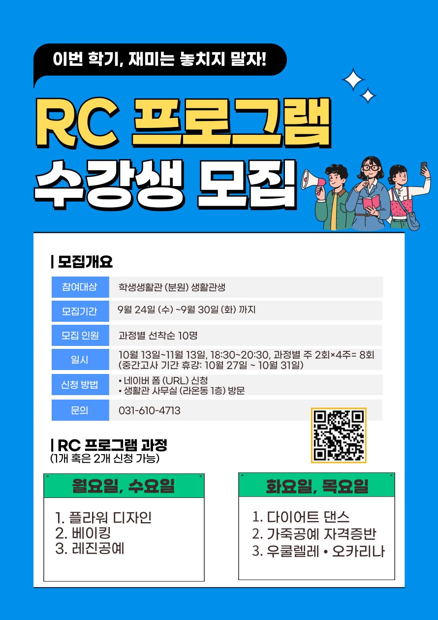 fnctId=bbs,fnctNo=429 단축 url 글번호 88894 2025년 2학기 RC 프로그램 수강생모집 작성일 2025.09.22 수정일 2025.09.23 작성자 학생생활관(분원) 조회수 1591 * 강의계획서 붙임파일 참고 첨부파일 2학기 RC프로그램 강의계획서.pdf